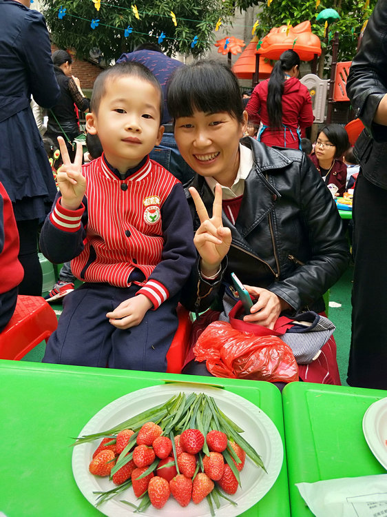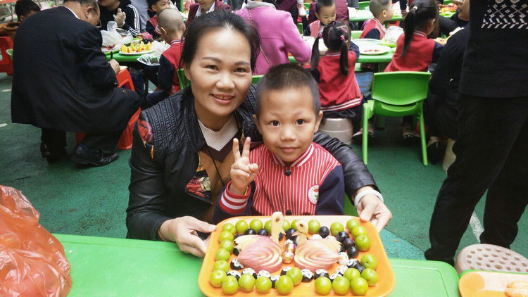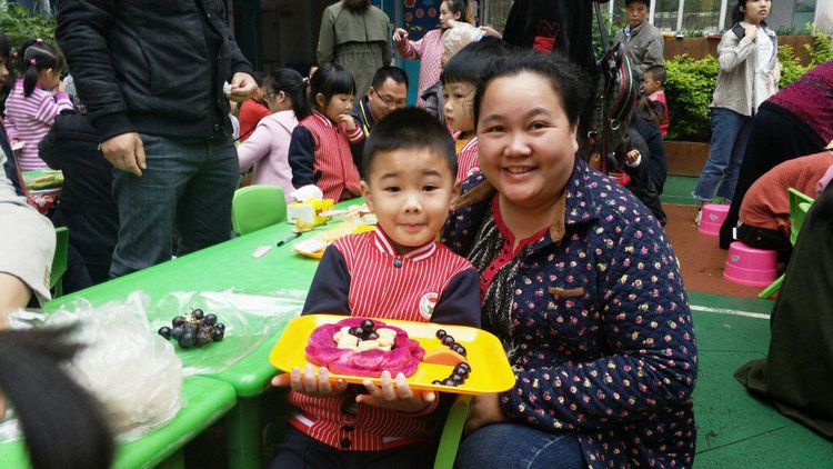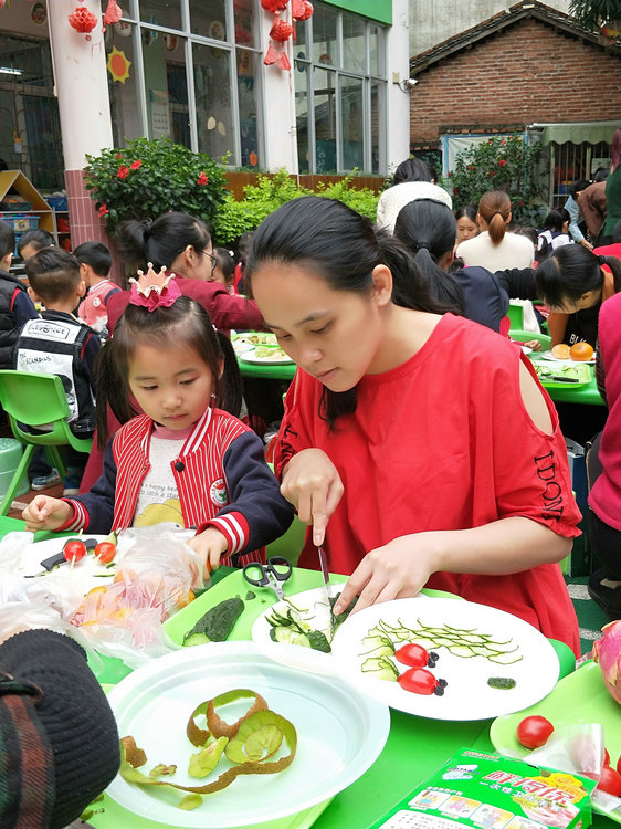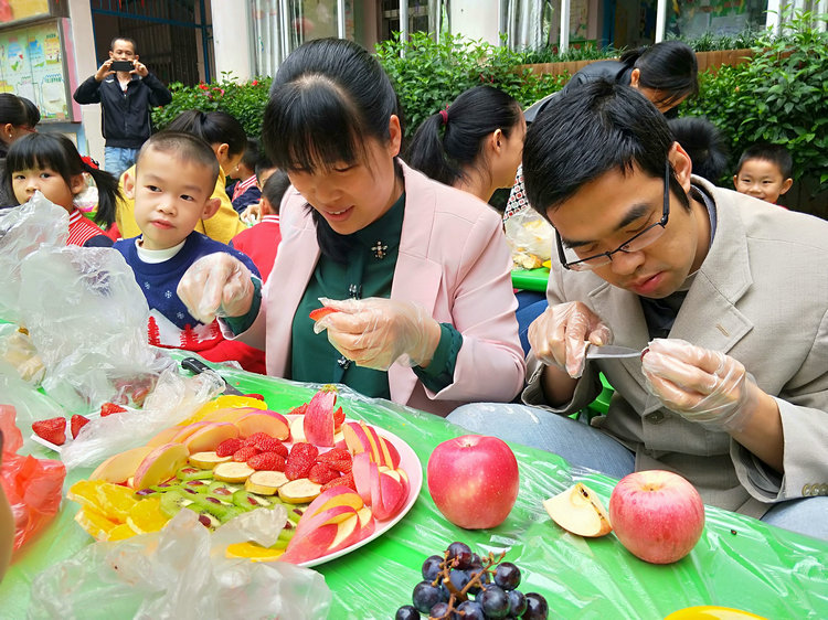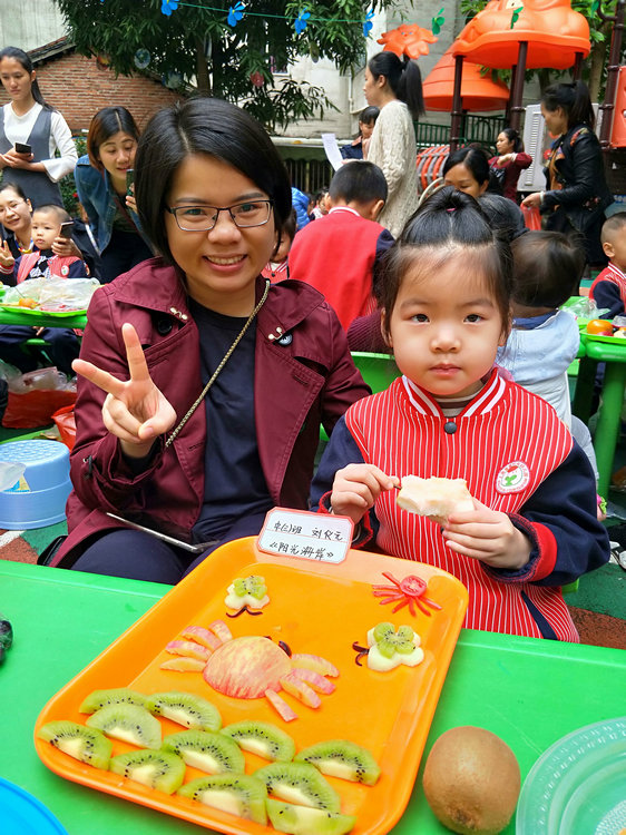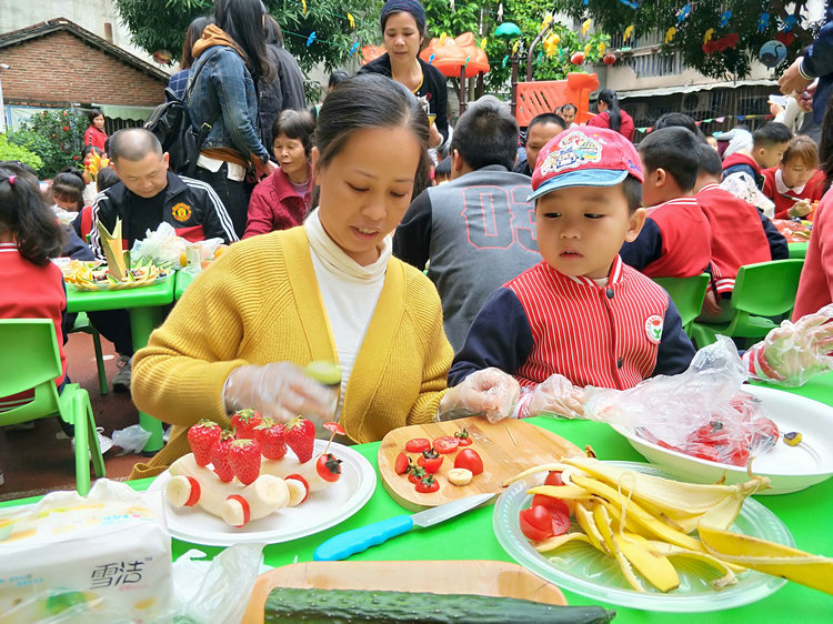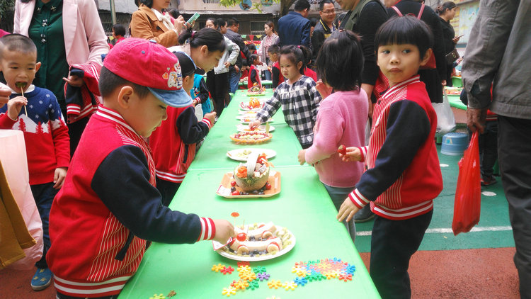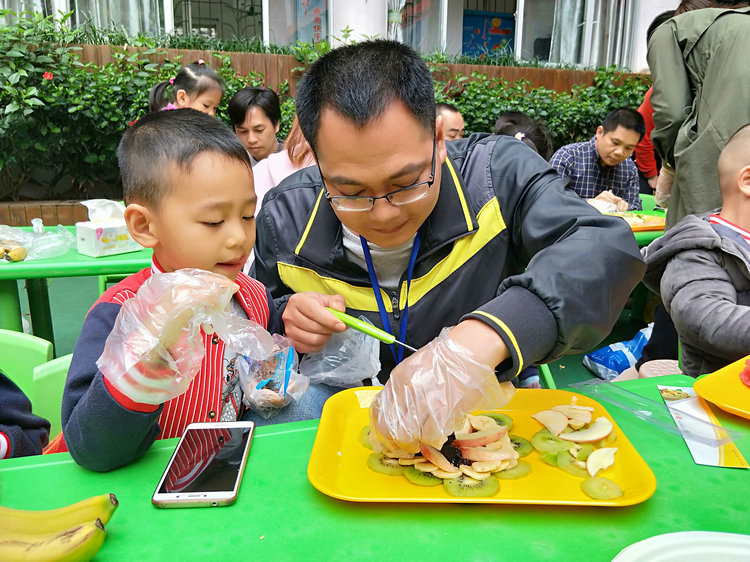 之后,参加活动的家长和孩子根据自带的水果,加上自己的设计理念,在30分钟时间内完成现场创作。全家总动员,连宝宝也一起动手完成自己的创作。