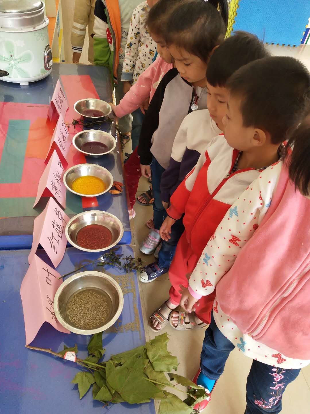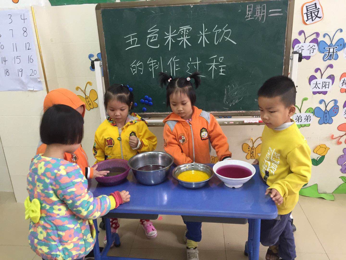 ? ? 一、教师们在课余时间用红兰草、黄饭花、枫叶、紫蕃藤这些植物的汁浸泡糯米,做成红、黄、黑、紫、白五色糯米饭。