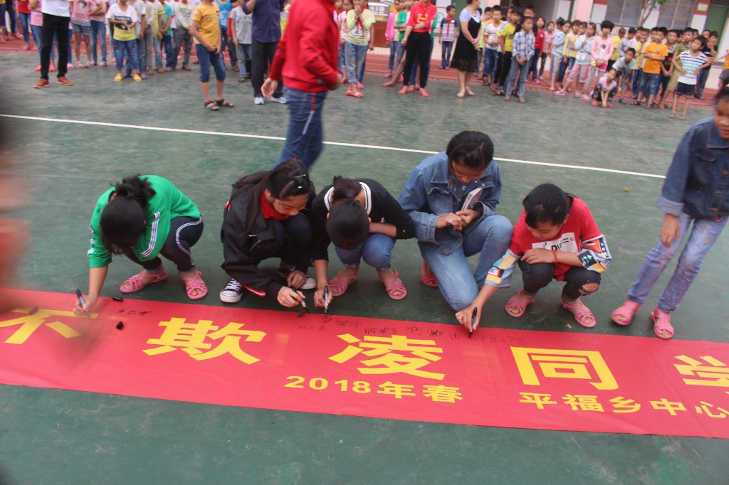 ? ? 为预防校园欺凌和校园暴力事件的发生,进一步提高学生抵制和防范校园欺凌的能力, 2018年 5月 8 日, 平福乡中心小学 利用 早操 课间组织全校学生开展“禁止校园欺凌从我做起”签名活动。