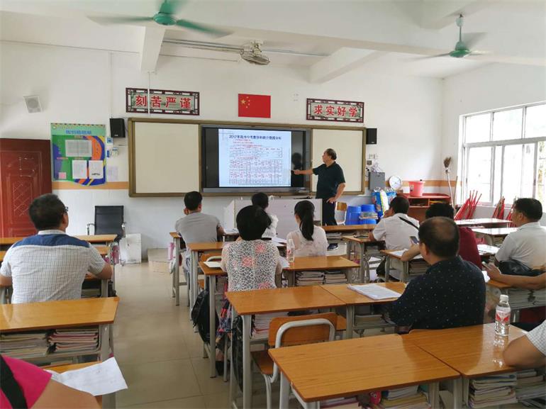 其次由我县教研室陆汉忠主任做今年中考备考阶段工作总结。陆主任重点对第一次模拟考试情况进行了全面的分析总结,指出存在的主要问题:学生厌学面广;学生基础普遍差;各校培优辅差的办法少,效果不大;之前的上课进度慢,备考复习时间少。针对存在问题,陆主任做了下一步备考工作建议:一、适当调整备考策略,力求备考工作高效。二、加强毕业班学生的思想动员工作,调动学生学习积极性。三、加强备考工作的领导。四、广大老师集思广益,提出好建议、好经验进行交流。陆主任进一步强调要求各科教师都能进一步提高认识,虚心学习,深钻考标,调整思路,提高课堂教学效率,确保2018年中考出好成绩。