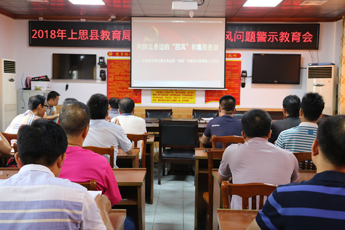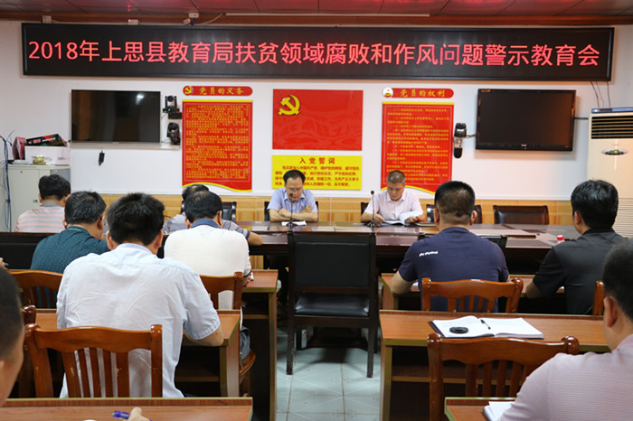 ??????? 5月16日上午,上思县教育局召开2018 年上思县教育局扶贫领域腐败和作风问题警示教育会,充分利用好本地廉政教育资源和典型案例,以发生在身边活生生的案例警醒全体干部职工,把警示教育抓在经常、融入日常,形成“不敢腐、不想腐”的氛围。