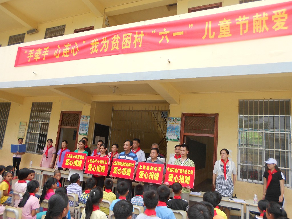“六一”儿童节来临之际, 在驻那明村第一书记陈书记的多方努力下, 2018年5月3 1 日 ,中国石油广西石化钦州分公司,上思县财政局,上思县附小,上思县才子服装店,上思县心语蛋糕店的领导和工作人员 到平福乡 那明村小学 对留守、贫困儿童进行走访慰问 献爱心 活动,切实为留守、贫困儿童办实事、做好事、解难事。 此次活动捐赠的物品有书包、服装、学习用品、体育器材等,孩子们接受捐赠后表示努力学习,长大后做一名对社会有用的人!同时校方也感谢社会各界的献爱心义举!