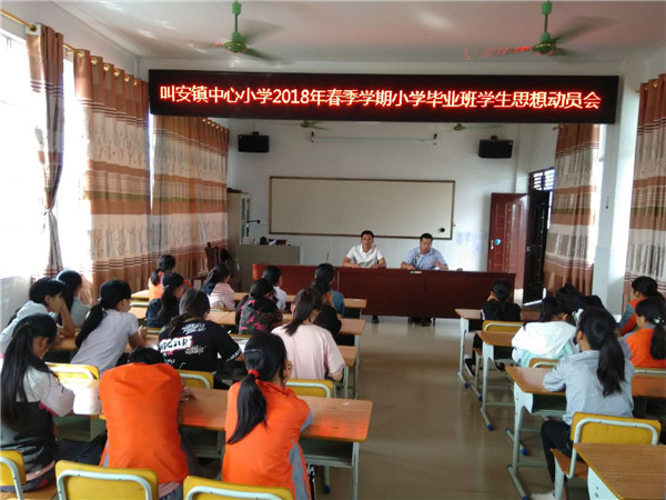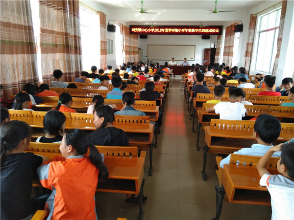 为了进一步抓好毕业班复习指导工作,促进毕业班每一位同学积极健康地成长,?6月5日下午,叫安镇中心小学在多媒体教室召开了毕业班思想动员会。会议由农明憧副校长主持,学校教务处、科研处及六年级师生参加了会议。