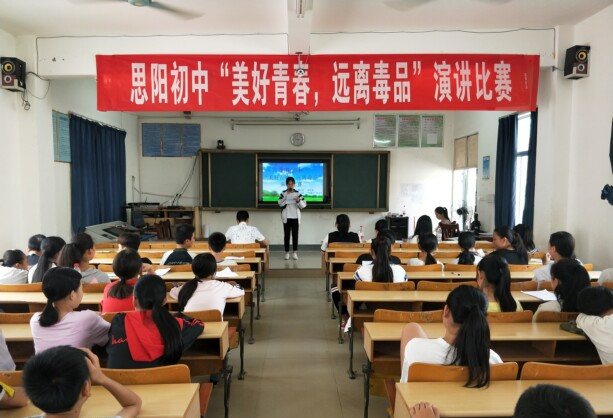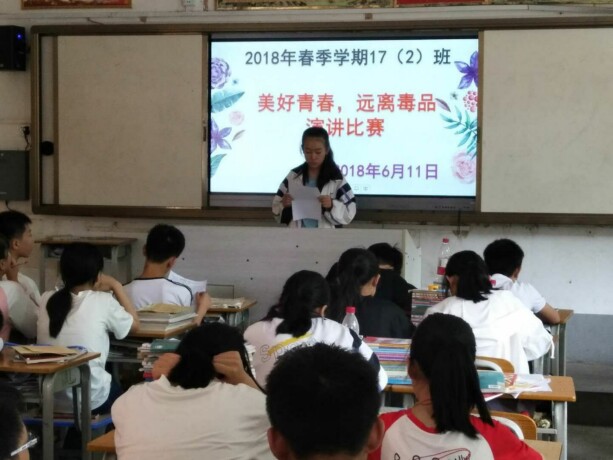 ? 活动一:开展“美好青春,远离毒品”演讲比赛,各个班级先在班内组织开展演讲初赛,再由同学们选出选手参加校园决赛,学校的禁毒演讲决赛于6月14日下午在多媒体教室举行,经过激烈的角逐,最终选出了此次演讲比赛的十佳演讲选手。